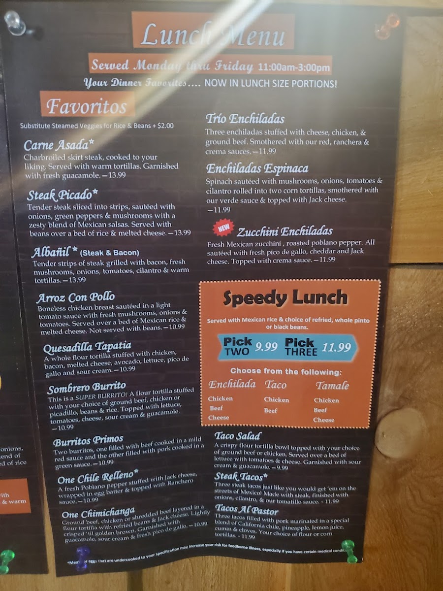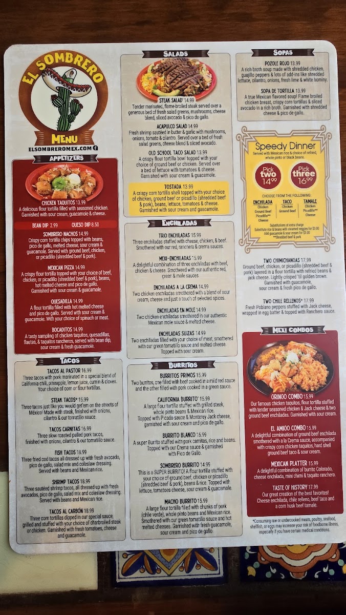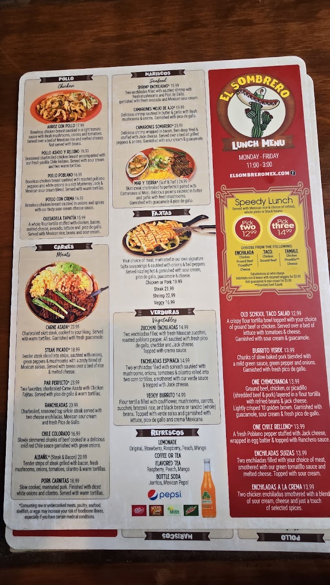 The menu at El Sombrero Family Mexican offers a casual, approachable selection of classic Mexican dishes and comforting drinks, perfect for relaxed gatherings or casual meals any day of the week. Guests can enjoy familiar favorites like zesty Fish Tacos and hearty Carne Asada Plates alongside creative takes such as Zucchini Enchiladas or the flavorful Chile Relleno. The menu strikes a balance between satisfying lunches, shared plates, and lighter bites, providing options for all appetites.